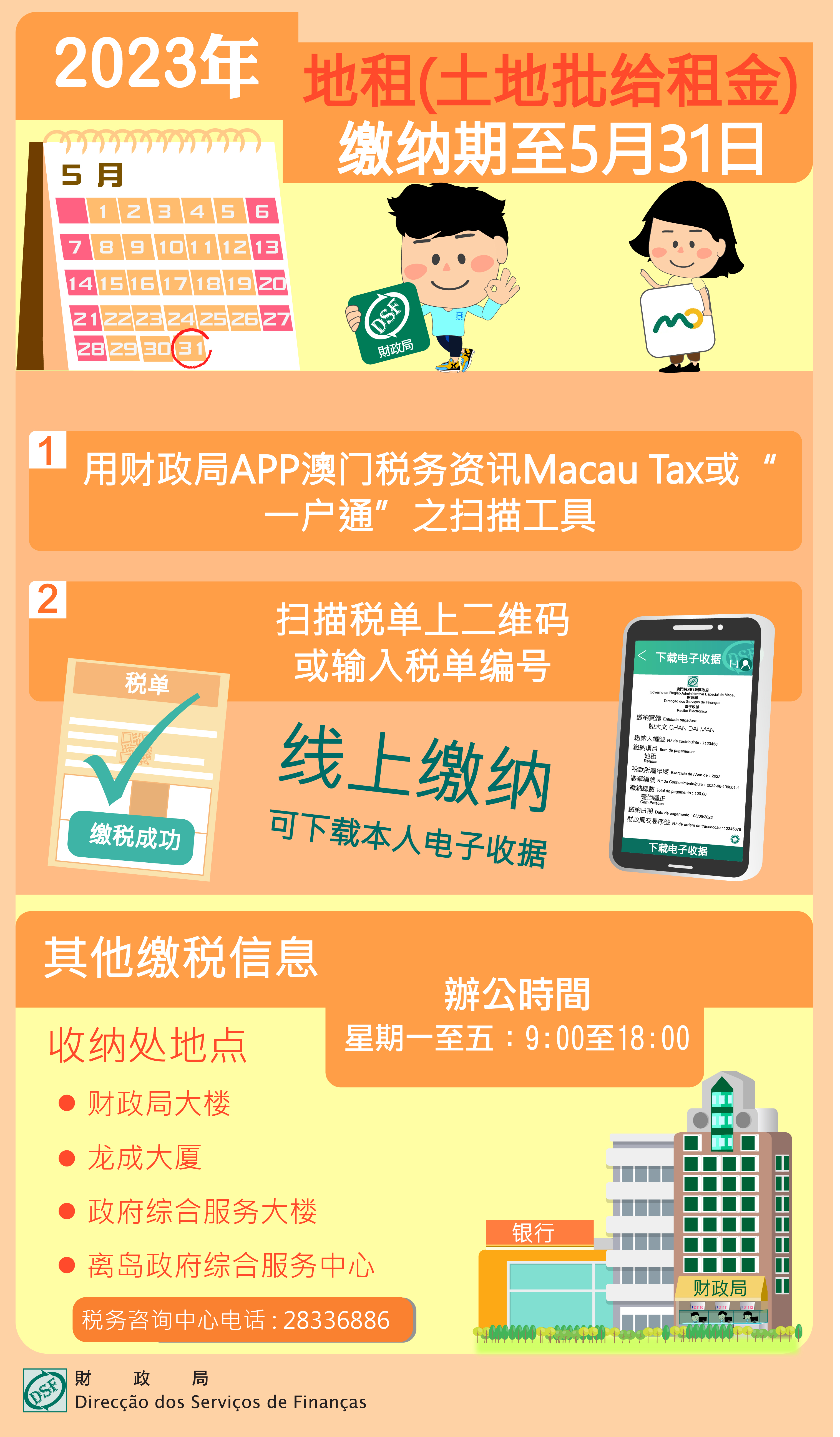 2023年地租(土地批给租金)最后缴纳期限至5月31日止,为免增加排队轮候时间或因逾期缴纳而须附加过期利息和罚款,财政局呼吁倘仍未缴纳上述地租纳税人尽快缴纳。