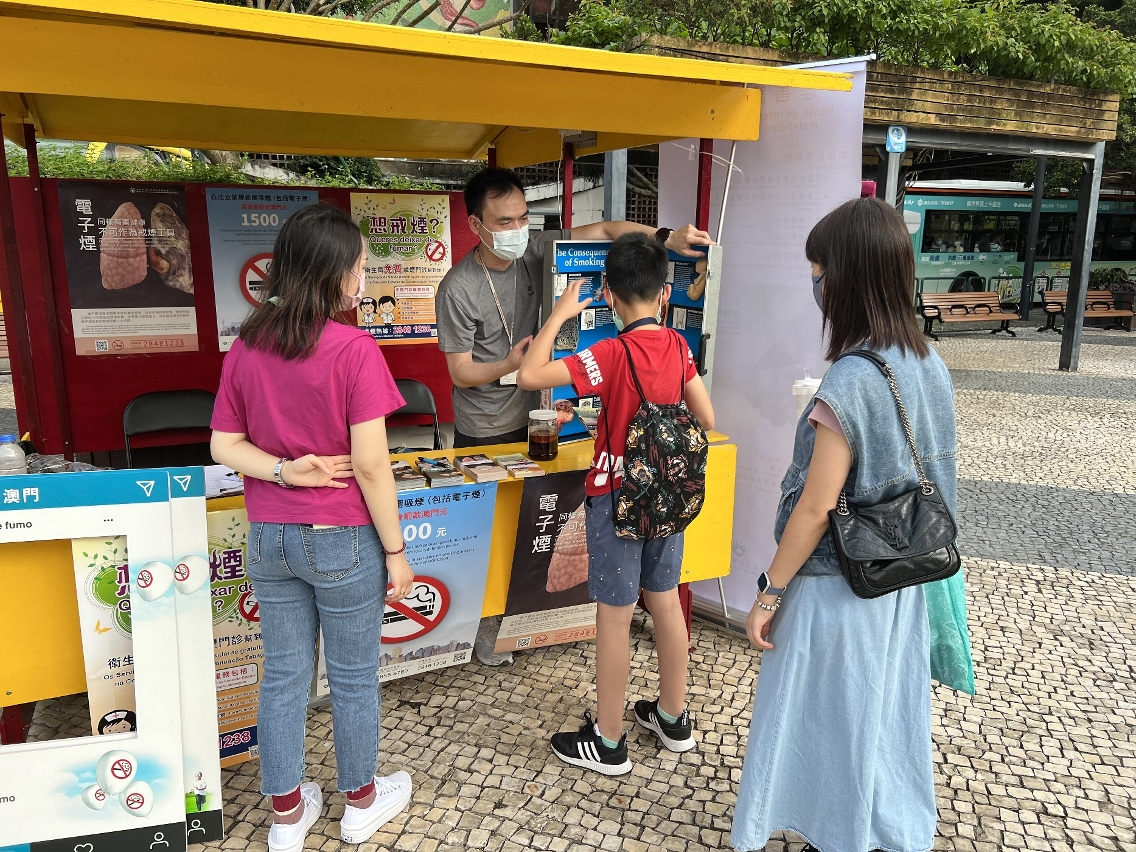 此外,卫生局于世界无烟日期间亦举办了“烟害咨询站”活动,于5月的每周六下午轮流于塔石广场、飞喇士街休憩区、氹仔花城公园侧、黑沙环公园等地设置站点,即场为居民解答有关烟害的查询、为有计划戒烟人士提供尼古丁依赖程度测试及血压测量服务,以及宣传戒烟门诊服务;现场亦摆放烟害展示板及模型教具,并提供“下一代 无烟害”为主题的拍照相框道具供居民拍照留念。