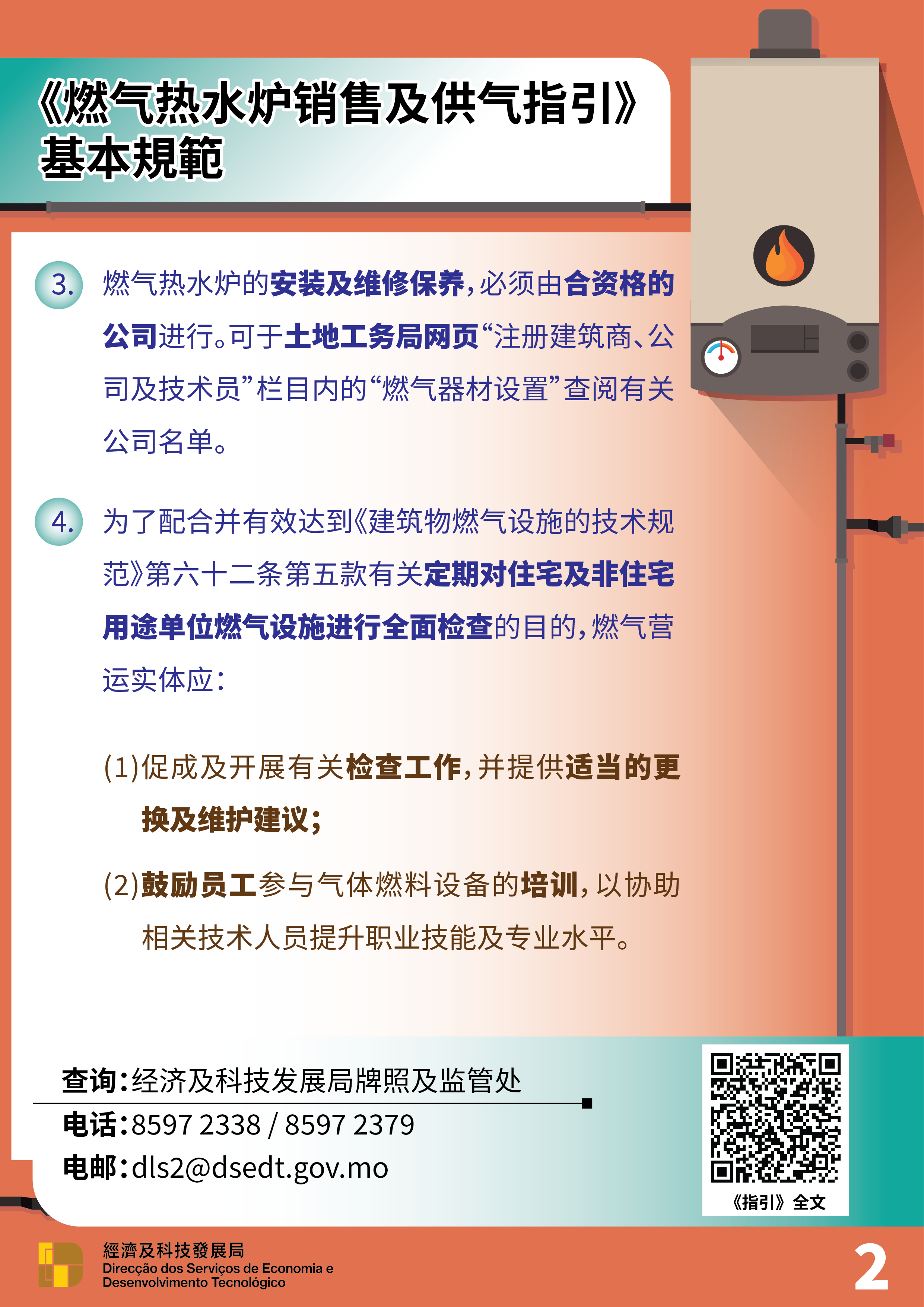 有关《燃气热水炉销售及供气指引》的内容可参阅经科局网页 ( https://www.dsedt.gov.mo ) 或扫瞄二维码。