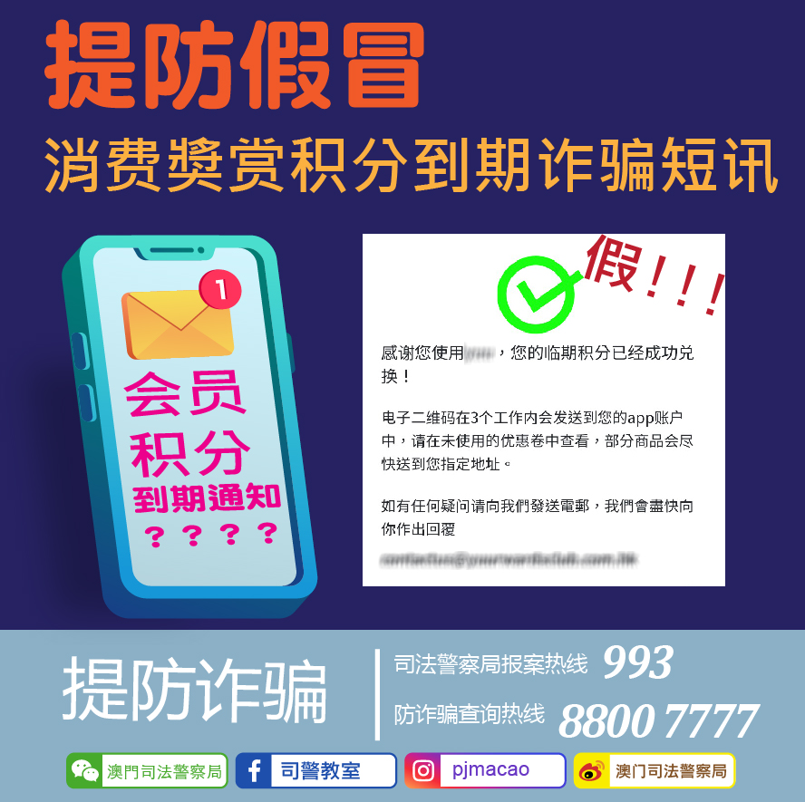 司法警察局再度接获假冒消费奖赏平台积分到期的钓鱼诈骗短讯举报。近日,有市民报称手机收到一则不明短讯,内容指其某消费奖赏平台的帐户积分结余将马上到期,并附带一个加购换领奖品之连结。事主点击后进入了一个假冒有关平台之钓鱼网站,并输入了其身份资料、信用卡资料,过程中事主亦曾输入信用卡一次性短讯确认码以进行交易及兑换礼品。直至翌日,事主方发现其信用卡被绑定某移动支付平台,以及进行多笔大额交易。