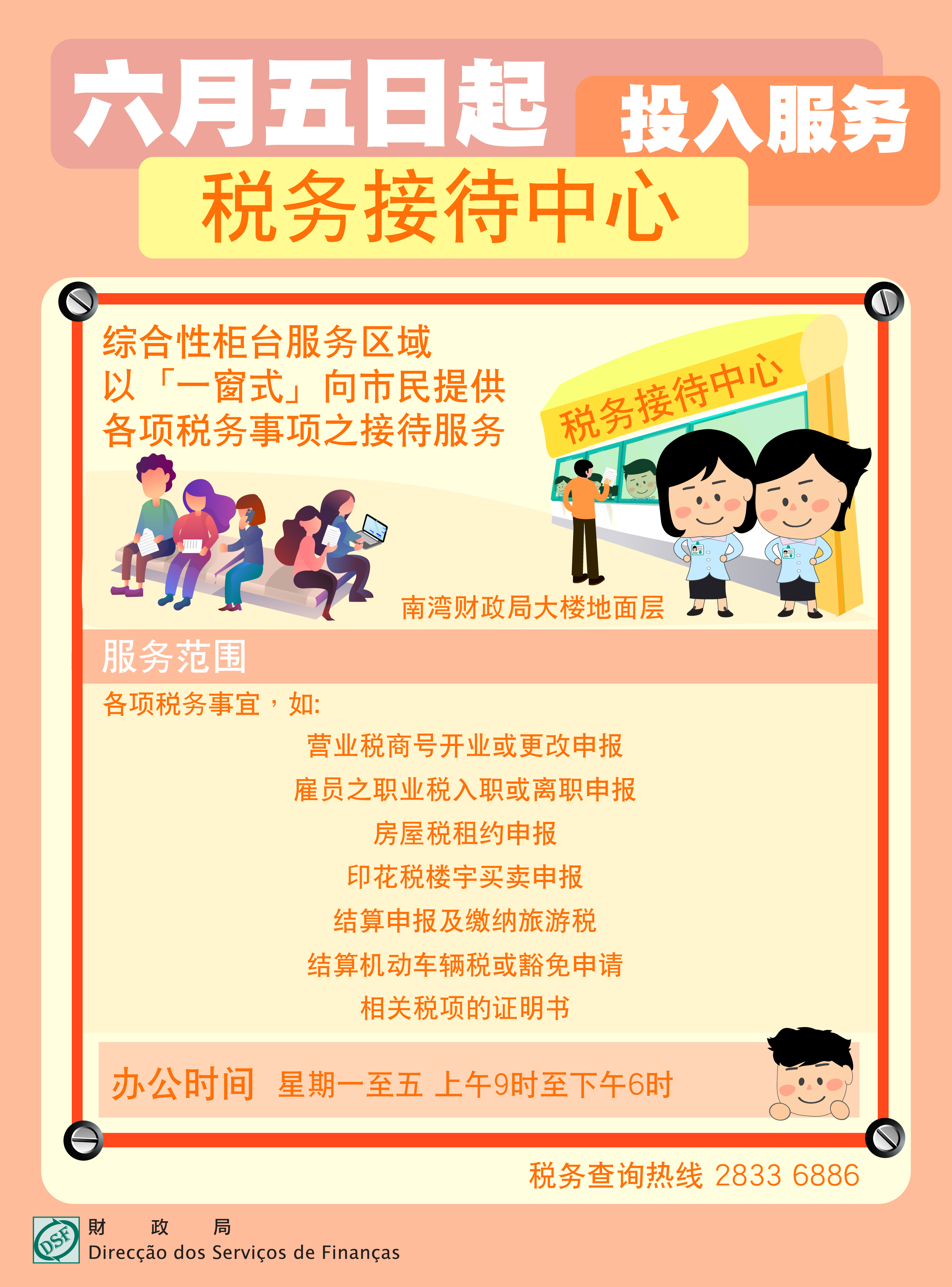 为了使市民更便捷办理各项税务事宜,财政局持续优化税务接待工作,自2023年6月5日起,位于南湾大马路财政局大楼地面层(第一服务中心)及阁楼(第二服务中心)的接待柜台,将整合为「税务接待中心」,全面以「一窗式」向市民提供各项税务事宜之接待服务。