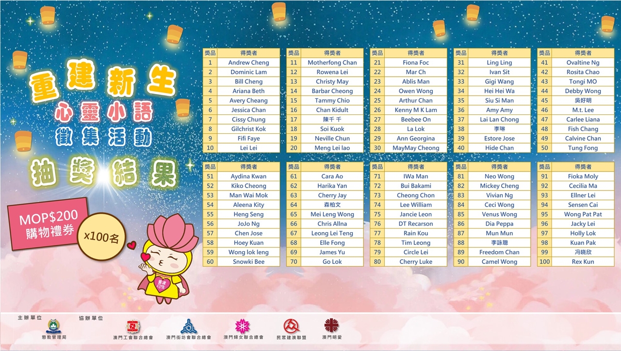 于6月21日,惩教管理局为是次活动举行了抽奖仪式,由程况明局长主持,顺利抽出100名得奖者,每人均可获得价值200元的购物礼券;同时,公布了符合活动规则的首50名留言者名单,每人各可获得纪念品乙份。所有得奖名单已上载至惩教管理局的网页、微信公众号和Facebook专页,以供查阅,将有专人通知所有得奖者领奖事宜。如有任何查询,请致电88961280或88961283。