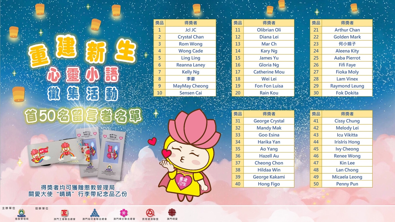 为持续推动社会关注及支持在囚人和院生重建新生,惩教管理局于早前联同澳门工会联合总会、澳门街坊会联合总会、澳门妇女联合总会、民众建澳联盟,以及澳门明爱举办的“重建新生心灵小语”征集活动已顺利结束,活动吸引了逾400位市民参与,于Facebook留下心灵小语,支持和鼓励在囚人及院生。
