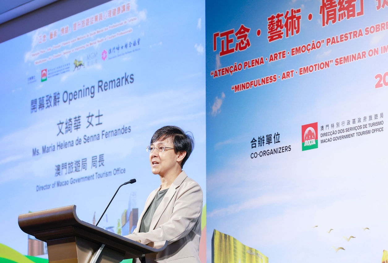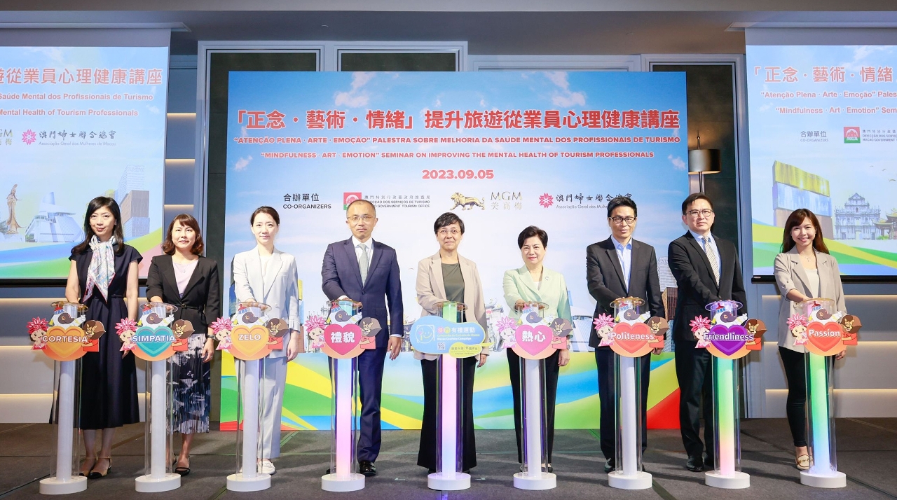 旅游局与美高梅及澳门妇女联合总会合办的“正念 · 艺术 · 情绪”提升旅游从业员心理健康讲座今(5日)于美狮美高梅举行。讲座以正念为主题,结合艺术创作,提升旅游业界从业员的职业心理素质,打造澳门有礼城市的形象,巩固世界旅游休闲中心地位。