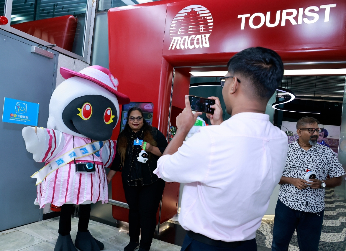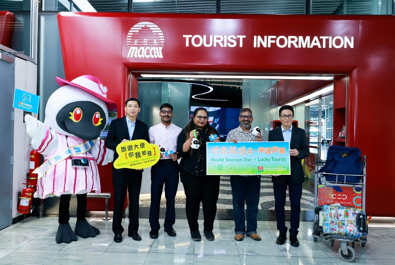 旅游局代局长程卫东和副局长许耀明于今(27日)早上到澳门国际机场欢迎“世界旅游日"的幸运旅客并致送礼品。来自马来西亚的Ravindran一家对于成为今年的幸运旅客感到惊喜。Ravindran夫妇表示,这次送儿子来澳门升学,会顺道在澳门旅游观光,四至五天的行程将游览大三巴牌坊及妈阁庙等世遗景点,并在中秋佳节走进社区感受节日气氛,也安排前往香港以体验港澳联游的便利。