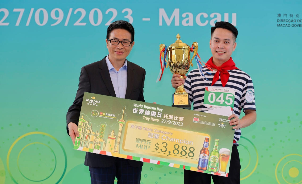 起步枪响起,托盘比赛正式开始,当中参赛特别嘉宾 - 澳门旅游吉祥物“麦麦"穿着“澳门有礼运动”服饰,手持载有一瓶“澳门啤酒"的托盘从大三巴牌坊出发,与一众参赛者一同起步,穿梭“澳门历史城区"街道,务求尽快将啤酒安全送达终点站议事亭前地,过程刺激有趣,沿途吸引旅客驻足拍照,替参赛者打气,展现澳门的旅游魅力。