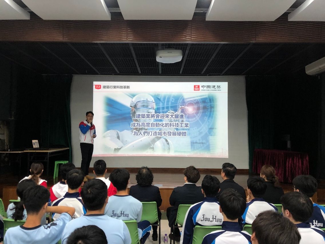 中建派出4名青年工程师以「澳门建筑业发展及选读分享」为题,向场内高中生介绍澳门建筑业的发展现况,指出建筑业在本地生产总值占比相对稳定,并表示近年政府透过公共工程及基建项目投放,如大型社会设施、医疗综合体、轨道、高架、桥梁等设施不断增加,使城市面貌不断更新,同时创造了不少就业机会,在稳定居民的就业起重要作用,4名青年工程师亦分享各自在建筑行业内的专业发展的经历,又指出科技发展亦赋能建筑工地迈向智能化管理,建筑业亦朝向现代化发展,分享有助开拓高中生对建筑业的职业发展视野。