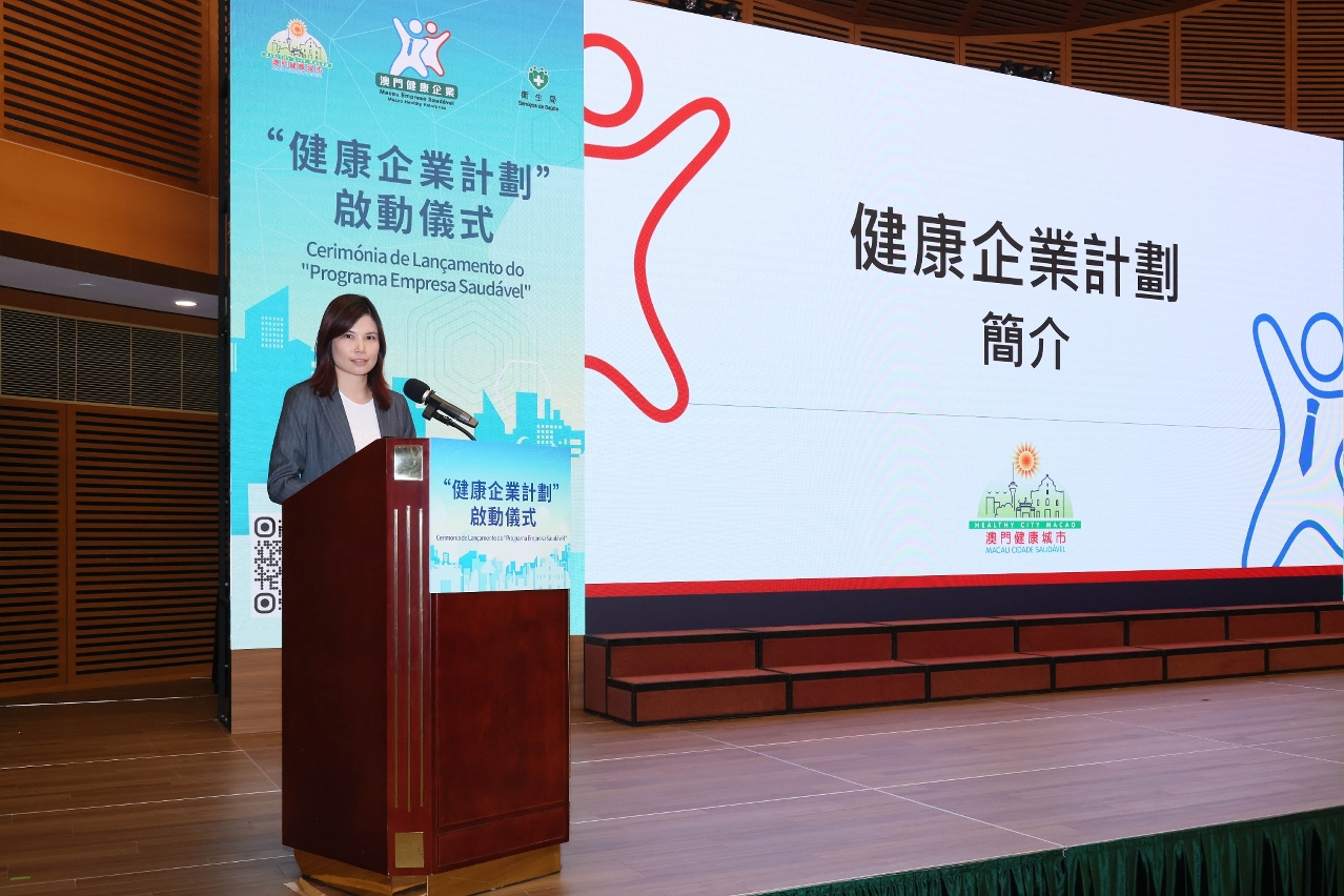 卫生局健康促进处黄颖雯处长于启动仪式上向出席者介绍了计划的宗旨和内容。她指出,目前本澳总劳动人口约为38万人,占总人口的一半以上,人均每日约有三分一时间处于工作场所。推出“健康企业计划”的核心目标是为员工创造一个健康、积极、高效的工作环境。优化工作场所的政策和环境对提升劳动人口的健康至关重要。