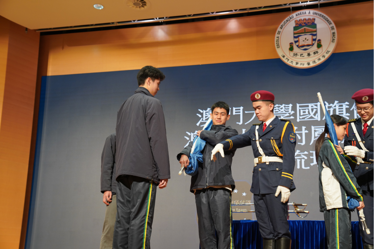 澳门大学附属应用学校校长卢兰馨和多名师生出席活动。澳大国旗仪仗队的骨干成员和澳大附校升旗队队员首先采用联合升旗模式,在该校操场以铿锵有力的步伐、整齐划一的动作完成升旗。