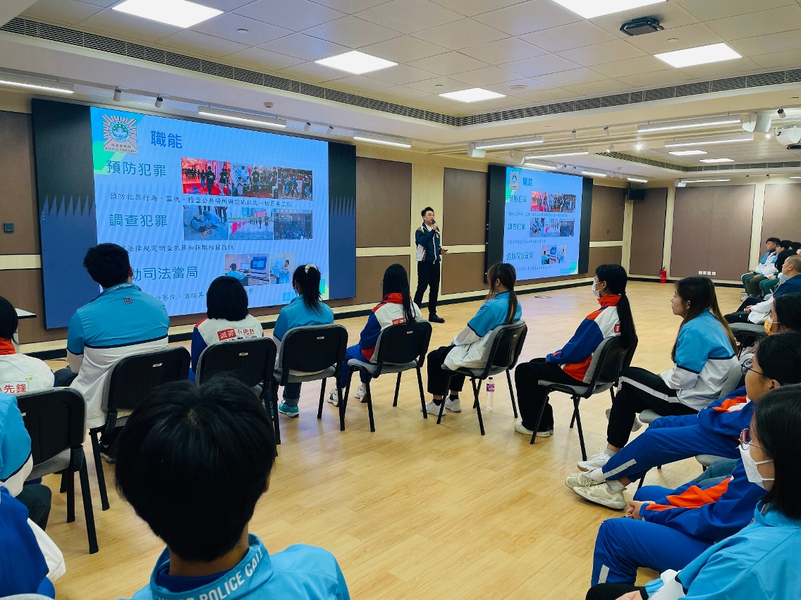 香港警务处公共关系部少年警讯组总督察胡世耀率领少年警讯会员到访参观司法警察学校,并与司警局“社区安全青年领袖计划”及“灭罪小先锋种子计划”学员会面交流,两地青年互相分享参与警方防罪宣传工作的心得和体会,促进对两地警务工作的认识,并建立了友谊。