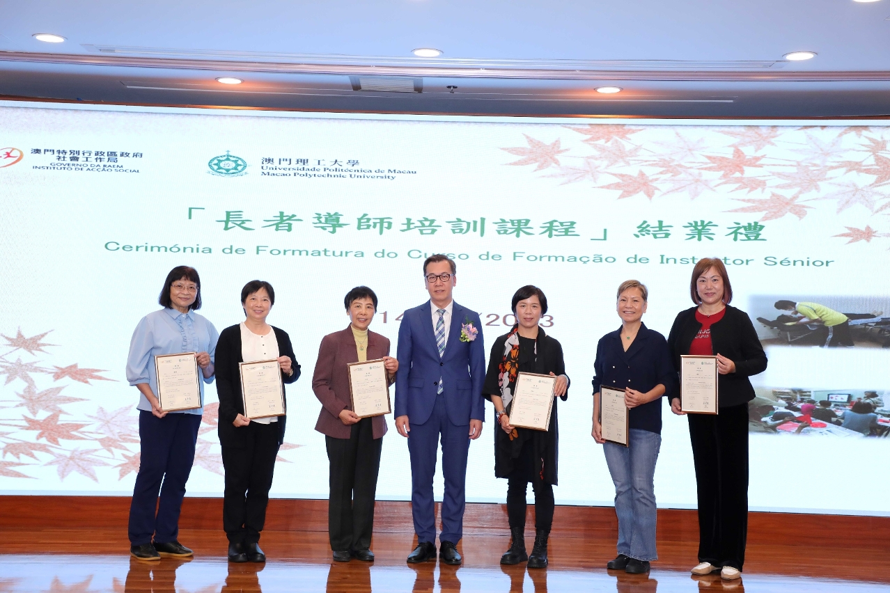 由社会工作局与澳门理工大学长者书院合办的第四届「长者导师培训课程」于2023年12 月14 日在澳门理工大学举行了结业礼,共有 12 名学员获发结业证书。