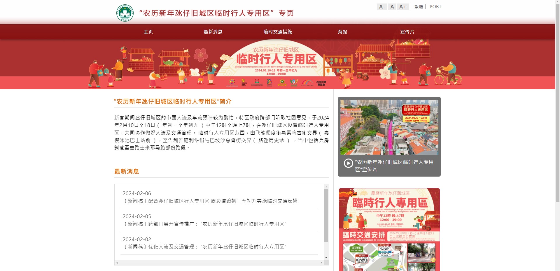 为方便公众查阅最新资讯,政府跨部门开通网上专页(https://www.dsedt.gov.mo/taipapedestrianzone),加强线上宣传推广及持续更新。内容包括:整体简介、临时交通安排、巴士改道资讯、宣传视频、海报、图文包及最新消息等。