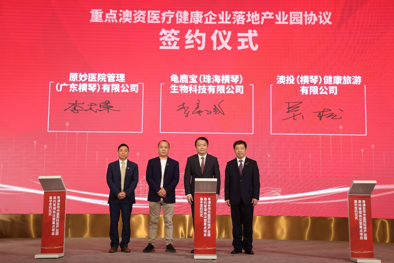 在澳门特别行政区行政长官、横琴粤澳深度合作区管理委员会主任贺一诚,中央人民政府驻澳门特别行政区联络办公室主任郑新聪,中国太平保险集团董事长王思东,澳门特别行政区经济财政司司长、横琴粤澳深度合作区执行委员会主任李伟农和中国太平保险集团副总经理李可东见证下,由澳门投资发展股份有限公司主席吴建峰与太平资本保险资产管理有限公司总经理吴松代表双方签署《粤澳合作中医药科技产业园委托管理协议》,正式建立委托管理关系,共同推进产业园提升服务品质,加快产业聚集。国家中医药管理局局长余艶红,副局长兼中国中医科学院院长黄璐琦,广东省政府横琴办主任、横琴粤澳深度合作区执行委员会副主任聂新平,中国银行业务管理总监赵蓉,中国工程院院士、中医证候全国重点实验室主任刘良教授等出席签约仪式。
