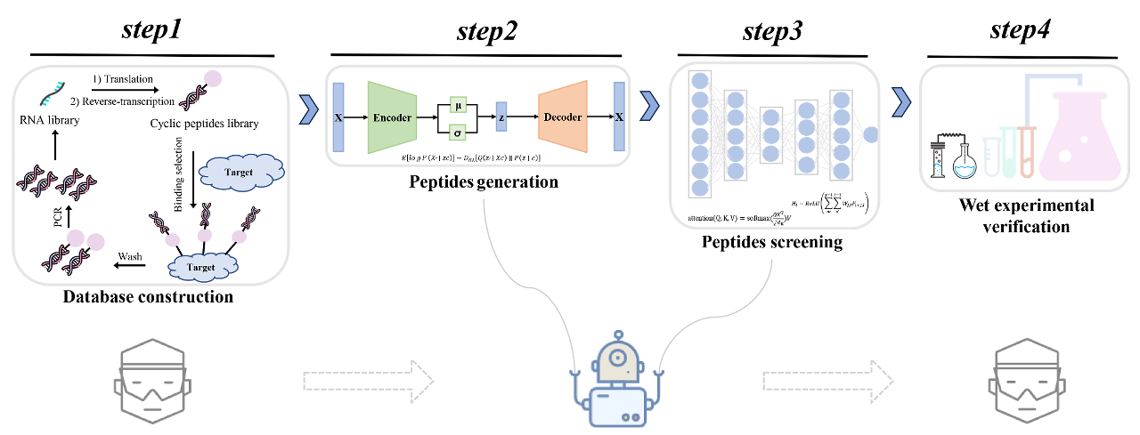《化学资讯与建模》期刊是专注于化学综合领域的着名学术期刊,发表化学资讯学和分子建模领域的新方法或重要应用的成果。为特定目标开发潜在活性肽对于现代药物工业的成长至关重要,本研究提出了一个高效的计算框架,用于发现针对特定药理目标的活性肽,结合了条件变分自编码器(CVAE)和基于Transformer和卷积神经网络(CNN)的分类器TCPP。通过将白细胞介素-17C(IL-17C)靶点在环肽DEL文库中进行筛选,得到肽段富集度数据集。CVAE模型在预处理的肽段数据集上进行训练,以生成潜在的活性肽,然后TCPP进一步筛选生成的肽段。模型预测的六个候选肽段被合成并进行活性试验,其中有四个肽段展示出与IL-17C有显着的结合亲和力。本研究提供了一个针对特定目标的活性肽段发现的一站式解决方案,有助推动肽药物开发的过程,以及大健康领域的发展与应用。