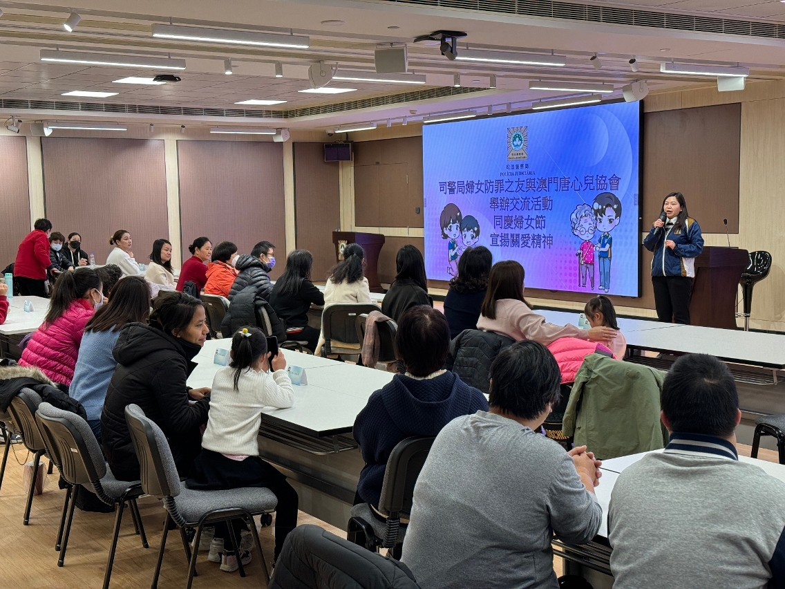 “三‧八”国际妇女节将至,为向弱势妇女和儿童群体送上节日关怀,司警局妇女防罪之友与澳门唐心儿协会组织亲子团共逾50人,于3月2日参观司法警察学校并进行交流活动。期间,一众家团及成员全情投入互动游戏,现场充满欢声笑语,在增进和谐家庭关系的同时,各家团交流分享日常生活中兼顾家庭与工作、养育子女等方面的经验,以及遇到的困难和解决办法,相互聆听、彼此鼓励,从而释放压力,提升正向能量,以更积极和健康的心态投入工作和家庭生活。