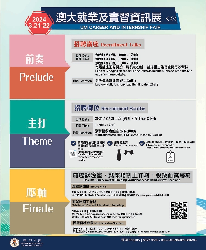 资讯展将于3月21及22日在澳大聚贤楼(N1)G008多功能厅举行,企业机构将由上午11时至下午5时摆设招聘摊位(下午4时半为最后入场时间)。欢迎全澳高校学生带备个人资料并穿着正装到现场进行就业配对,开拓理想前程。查询可致电88224839或电邮至sao.career@um.edu.mo与澳大生涯发展中心联络。