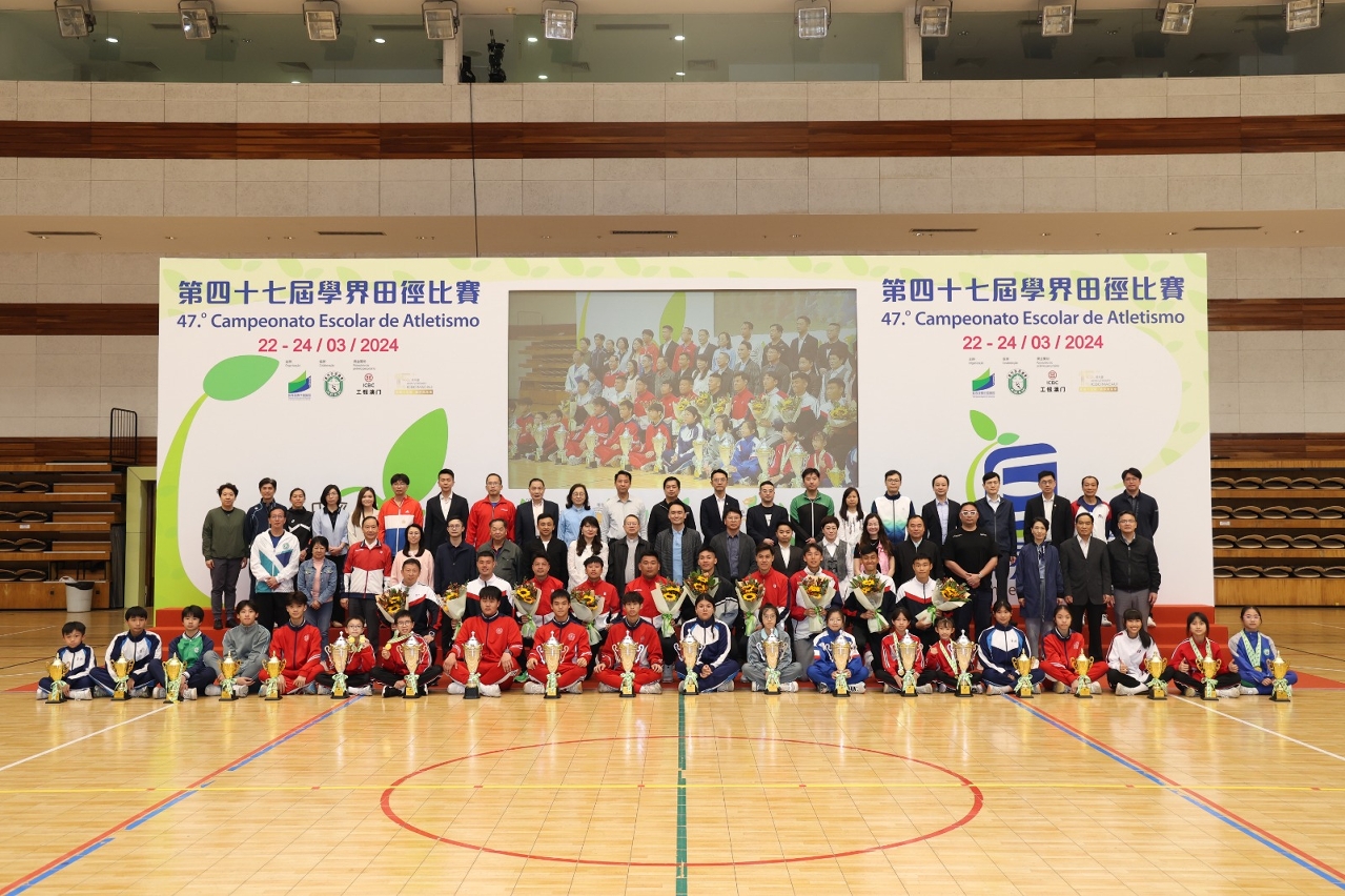 今届学界田径比赛共完成了10个组别共101项赛事,闭幕仪式于3月24日举行。教青局局长龚志明,副局长丁少雄、黄嘉祺,天主教澳门教区主教李斌生、澳门田径总会理事长陈步倩、工银澳门中小企业市场总监林毓霞博士、澳门中华教育会会长陈虹、天主教学校联会理事长黄彪、澳门公职教育协会理事长香梅、参赛高校、学校校长及运动员代表出席,为运动员坚毅不屈的运动精神喝采。