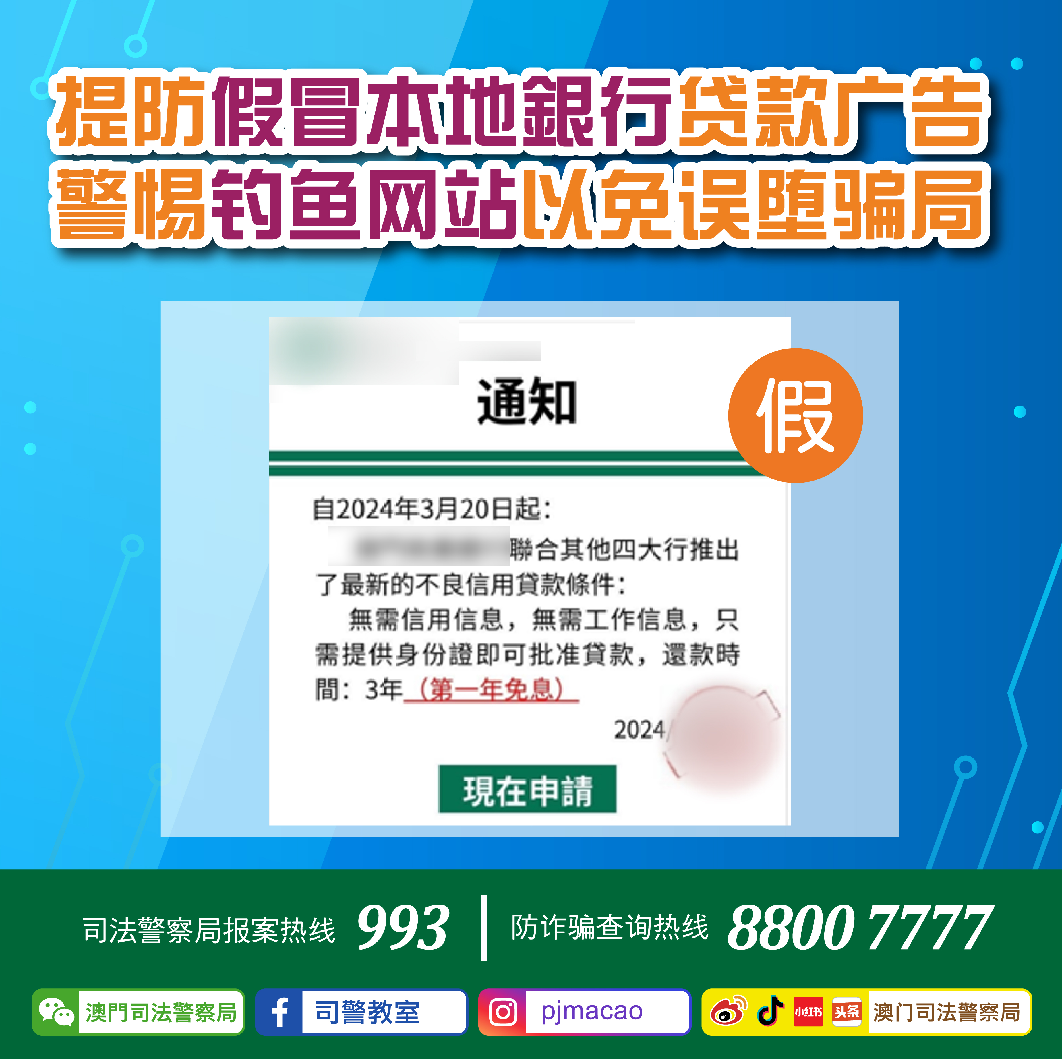 近日司警局接获有本地银行检举,指有人在网上社交平台冒用该银行名义发布不实贷款广告帖文,讹称该银行已推出「最新不良信用贷款条件」,着有意者点击广告内附带之连结进行申请。上述连结点击后将会跳转到另一个设置了多个贷款广告之页面,曾出现有邻埠银行及其他来历不明之贷款网站,但该等广告绑定之网站不断变动,真伪成疑。