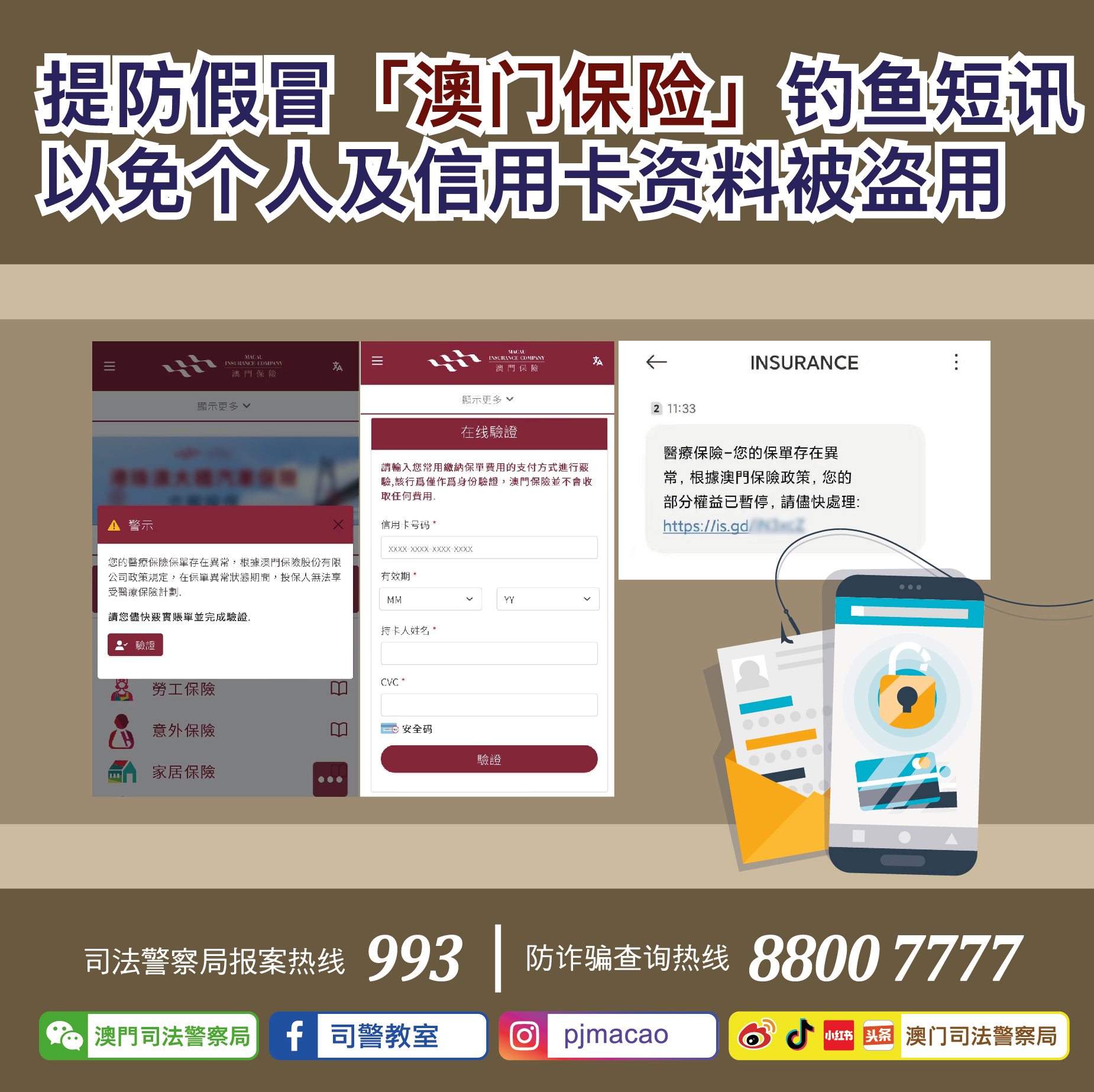 今日司警局发现有骗徒假冒“澳门保险”公司向市民发送短讯,内容讹称市民的医疗保单存在异常,诱骗市民点击短讯内之连结并进入一个假冒“澳门保险”公司之网站,及后以验证保单为由要求输入个人资料及信用卡资料。