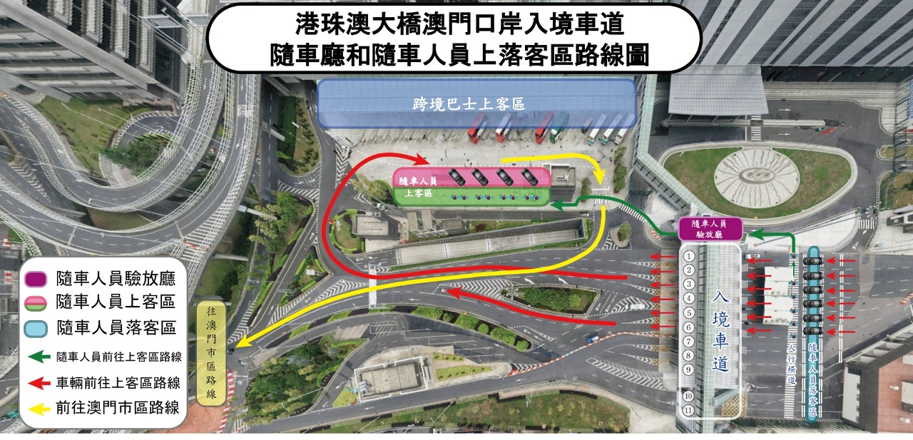 敬请驾驶者和乘客应留意现场指示牌及遵从工作人员指引,下车乘客沿人行横道有序前往随车人员验放厅办理入境手续后,在随车人员上客区上车。