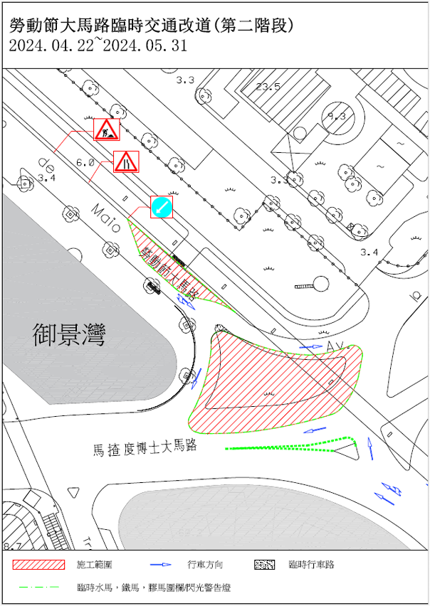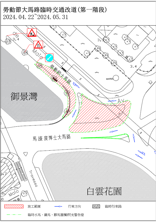 为配合本工程交通管线施工及重铺路面,劳动节大马路至马揸度博士大马路4月22日至5月31日期间分阶段实施有限度通车(详见附图1及2 )。请驾驶者留意现场交通指示标志或遵守现场交通警员的指挥及安排。