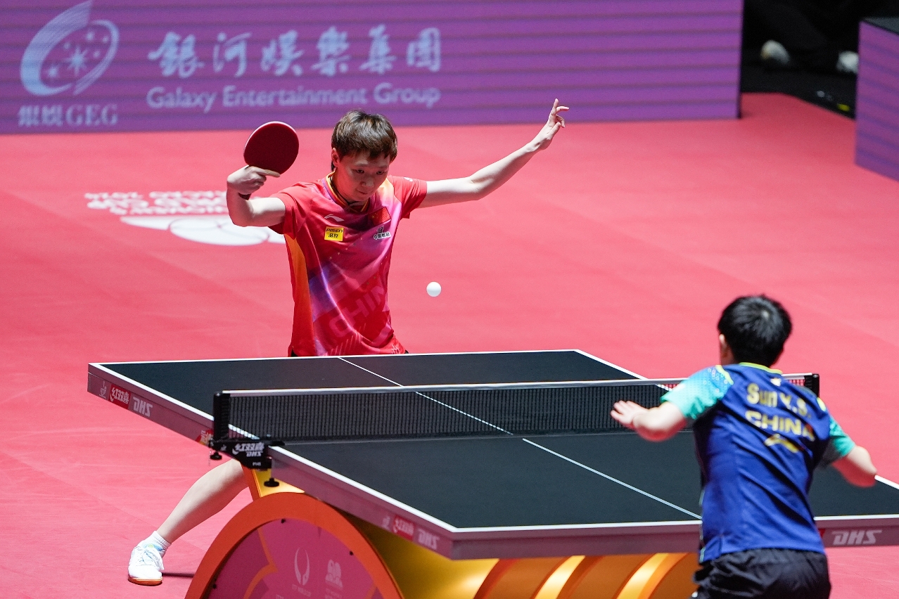今(21)日首场进行的赛事为女子世界杯决赛,为世界排名头两位的对决。孙颖莎对战王曼昱,双方相持激烈,互不相让,王曼昱曾一度将局数领先至3比1(11比8、11比5、4比11、11比5),惜孙颖莎凭较稳定的发挥及韧力,连追两盘11比8、11比5,追平局数3比3;决胜局,孙颖莎一度拉开5比1优势,最终摘下11比9局点,以局数4比3反胜,首夺女子世界杯冠军。
