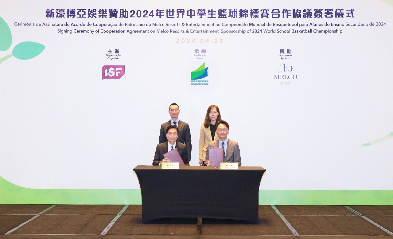 在社会文化司司长欧阳瑜和新濠博亚娱乐主席兼行政总裁何猷龙的见证下,教青局局长龚志明与新濠博亚娱乐董事钟玉文签署赞助2024年世界中学生篮球锦标赛合作协议。龚志明致辞时表示,适逢2024年是中华人民共和国成立75周年及澳门回归祖国25周年的双庆之年,特区政府藉举办高水平的学生体育赛事,不但提供机会让本澳学生与世界各地的学生在赛场上切磋及交流,而且有助对外推广本澳的体育及旅游事业,提升澳门在国际上的知名度。教青局与新濠在过往合作的基础上,新濠赞助是次锦标赛部分经费是创新的合作模式,发挥企业的资源助力体育赛事活动的举行,带动综合旅游休闲产业与体育产业的协同发展,在社会文化司的统筹下,教青局亦正推动区域性学界活动、文旅研学及国际性学生体育赛事等,丰富澳门“教育+旅游”的资源,开拓青年学生及其家庭客群的休闲旅游新体验。
