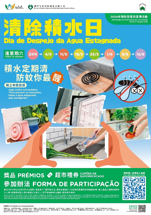 为进一步加强向居民宣传有关信息,预防登革热工作小组推出“积水定期清 防蚊你最醒”线上有奖游戏,居民可透过扫描宣传海报或市政署环境资讯网www.iam.gov.mo/macaohygiene内的二维码参与。游戏举办期间,居民逢星期六“清除积水日”清除家居积水,以及做好相关防蚊措施后可拍下照片,扫描游戏二维码并将照片上传,倘游戏期间上传次数达三次或以上,即有机会参加抽奖,赢取超市礼券。抽奖仪式将于七月进行,得奖结果会于环境资讯网内公布,并有专人通知得奖者。