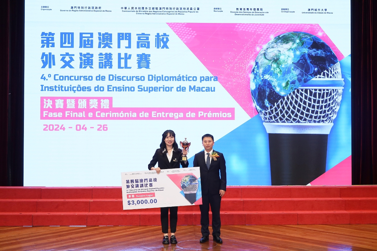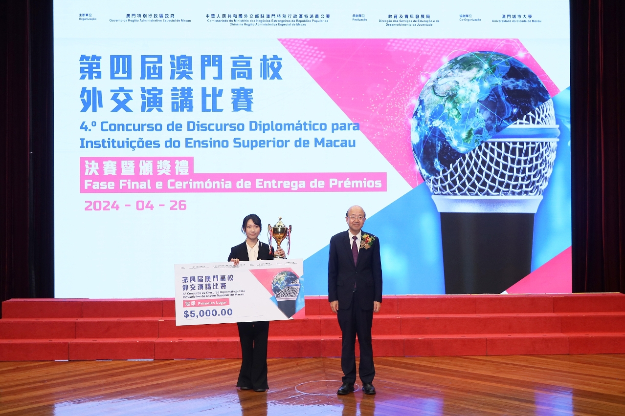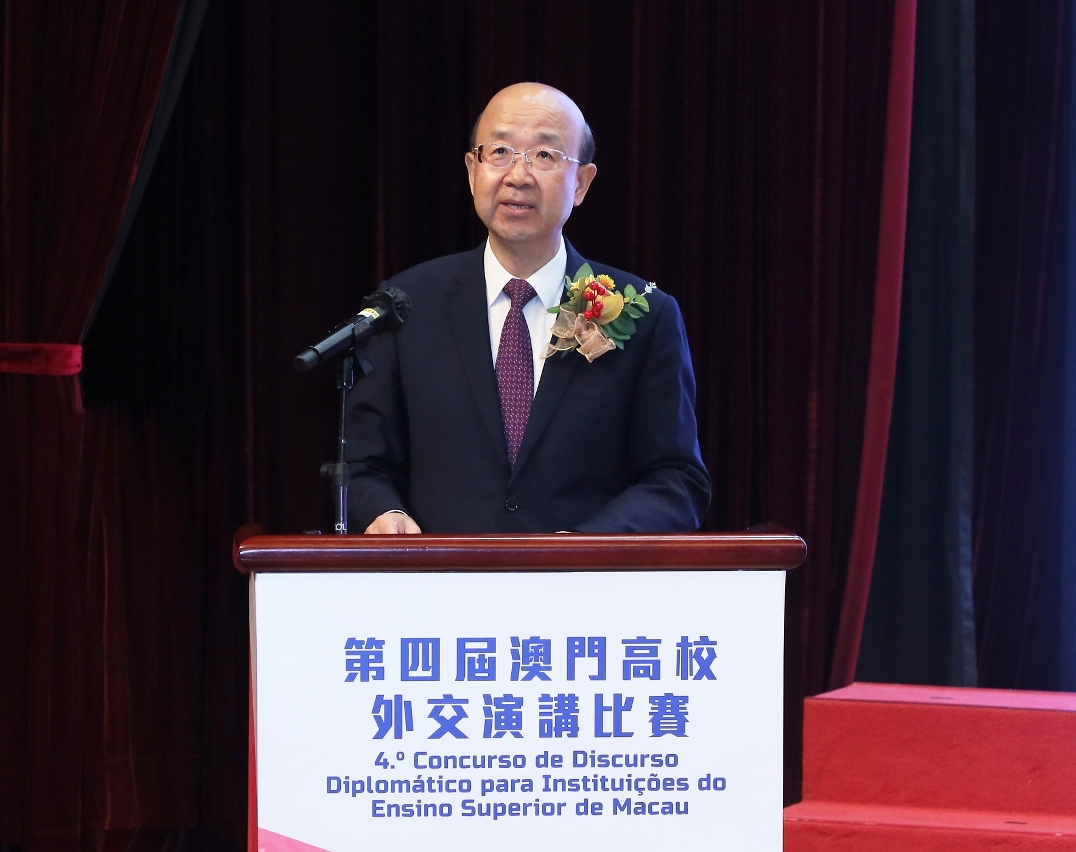由澳门特别行政区政府、中华人民共和国外交部驻澳门特别行政区特派员公署主办,教育及青年发展局承办、澳门城市大学协办的第四届澳门高校外交演讲比赛决赛于4月26日在澳门城市大学举行。出席嘉宾包括外交部驻澳门特别行政区特派员公署特派员刘显法、社会文化司司长欧阳瑜、中央人民政府驻澳门特别行政区联络办公室教育与青年工作部副部长李勇先、中国人民解放军驻澳门部队政治工作部副主任刘陈长大校、教青局局长龚志明、副局长丁少雄、阮佩贤、黄嘉祺、以及各高等院校领导。