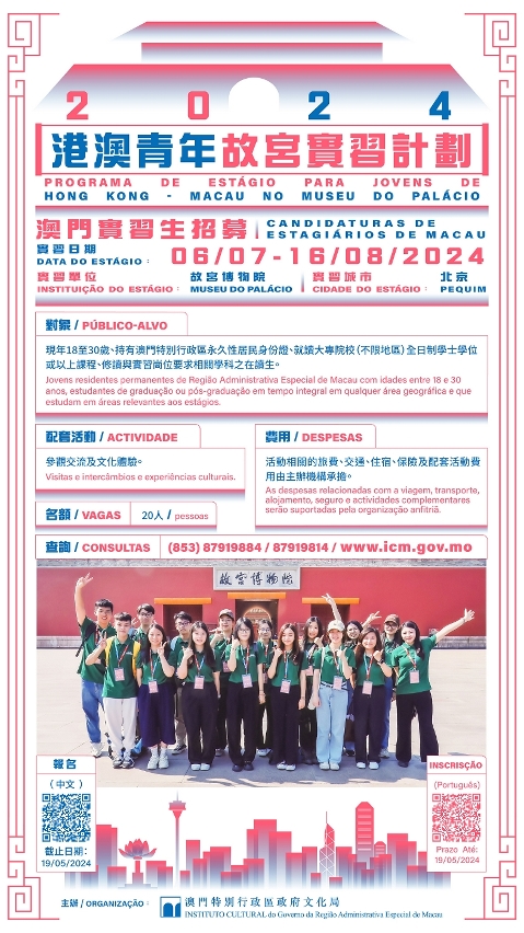 由澳门特别行政区政府文化局、香港特别行政区政府民政及青年事务局联合主办的“港澳青年故宫实习计划 2024”将于7月6日至8月16日举行,即日起至5月19日接受符合条件的澳门青年报名,实习计划可提供申请的岗位包括故宫博物院宣传教育部、文创事业部、世界遗产监测部、古建部、考古部、宫廷历史部、国际交流处及研究室等8个部门,涉及17种博物馆的工作范畴。