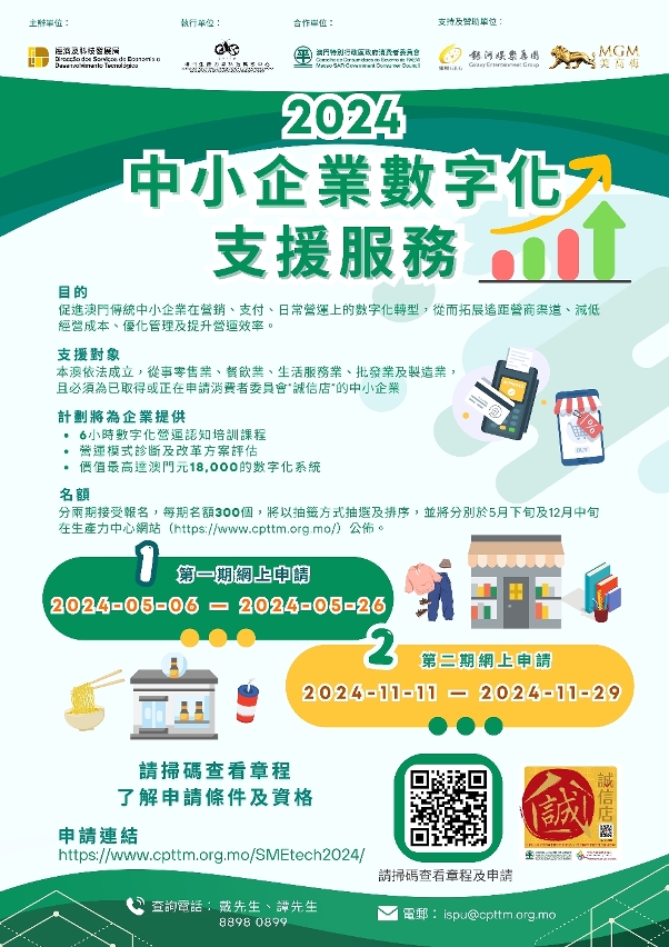 企业可透过扫描二维码或于网上申请:https://www.cpttm.org.mo/ecm/smetech2024/。如对计划有任何疑问,欢迎于办公时间与生产力中心联络,电话:8898 0899(戴先生或谭先生)或电邮至ispu@cpttm.org.mo。