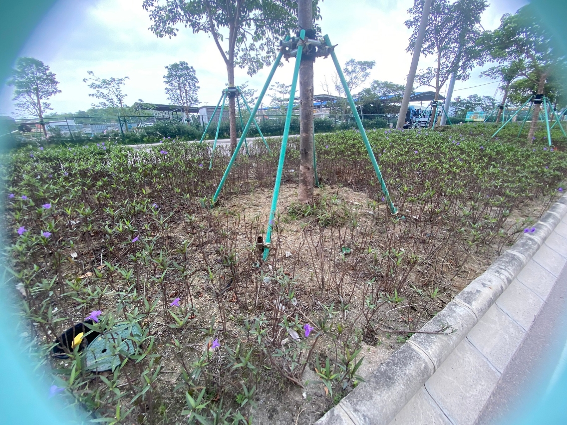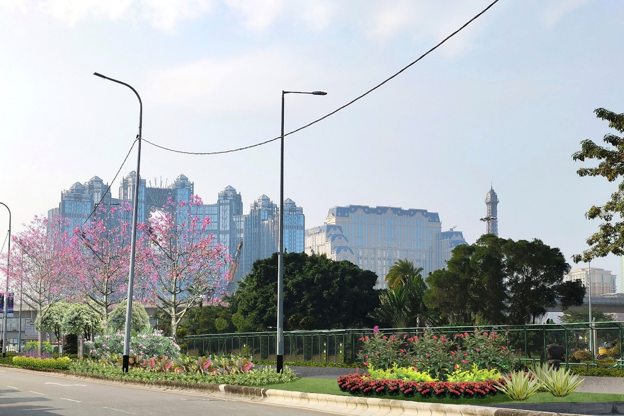 市政署积极有序在本澳主要交通干道、举办重要活动庆典位置周边的绿化区域进行重整。当中由于邻近澳门国际机场及澳门东亚运动会体育馆的航空圆形地、机场大马路(近上葡京一段)和莲花路(近澳门东亚运动会体育馆一段)的绿化区域植栽单一且部分植物生长不良,故将对有关路段进行绿化重整,并适当回收及移植健康的植物到其他合适地点。是次重整以“彩带”和“莲瓣”为设计主轴,透过种植不同品种和色彩的植物,如日日樱、美丽异木棉、翠芦莉、花叶大红花、双夹槐、彩霞变叶木、射干等,亦以堆砌土丘的方式打造出具四时变化的绿化景观,为本澳主干道添加庄重及具层次的景观效果,寓意澳门欣欣向荣。