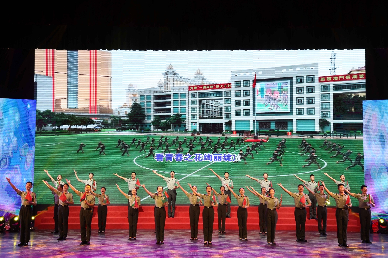 教育及青年发展局组织了18所学校约700名小学生走进氹仔军营与解放军官兵参加文艺联欢活动。文艺表演由本澳小学生与驻澳部队交替献艺,节目包括歌舞、醒狮、武术、合唱、川剧等,表演精彩絶伦,场内掌声不断。活动期间还精心安排了国防知识问答互动环节,学生们积极参与,现场气氛高涨。最后,中国人民解放军驻澳门部队合唱《强国有我》作为压轴演出,活动在愉快的气氛下圆满结束。