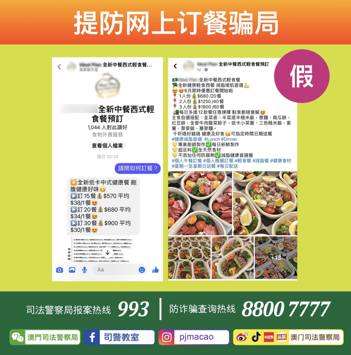 近日司警局先后接获逾十名市民检举,报称早前各自透过网上社交平台找到一个声称可提供“轻食餐”订餐服务的专页,该专页以优惠价一次性订购大量餐点为招徕,吸引各名事主分别向其订购了多份餐点又或分多日供应之送餐服务,并以网银向对方转账全数相关订餐费用。及后,对方并未依约定时间送餐且失联,更被有关专页加至黑名单,各人始怀疑被骗。事件中各名事主报称损失由数百至千余澳门元不等,合共损失逾8,000澳门元。