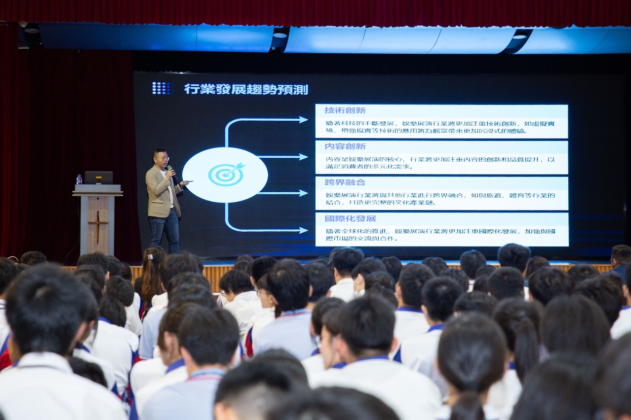 劳工局四月底邀请了博维智慧科技有限公司,为澳门浸信中学举办题为“娱乐展演与科技的深度融合”的“职问职讲”行业讲座。由业界代表介绍娱乐展演行业发展前景,该行业集音乐、舞蹈、戏剧、魔术等多种艺术表演的复合性行业,随着展演内容不断丰富,行业规模随之扩张,产业链不断延伸,衍生不少经济效益和就业机会。又为同学们就娱乐展演业国内外市场进行对比分析,并指出有关行业需要因应文化背景、消费习惯、演出方式,针对不同市场的制定发展策略。另外,亦介绍了科技创新在娱乐展演中的应用场景,大大增加了消费者的娱乐体验,并为同学们在科技创新与娱乐展演的学科选择上提供建议。