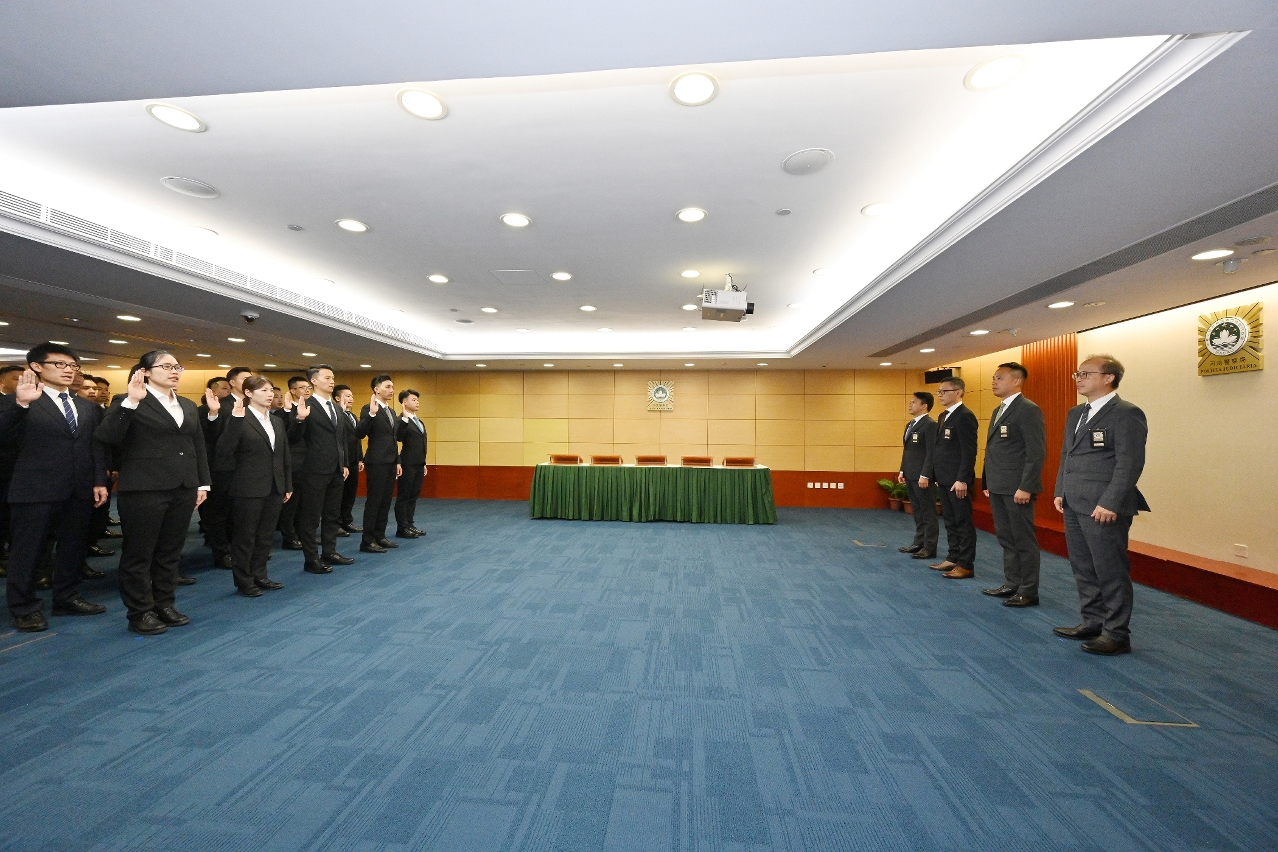 司法警察局于2024年9月5日举行首席刑事侦查员就职仪式。在薛仲明局长主礼及监誓,赖文威、苏兆强、岑锦荣三位副局长和各部门主管的见证下,共78名人员宣誓就任首席刑事侦查员。