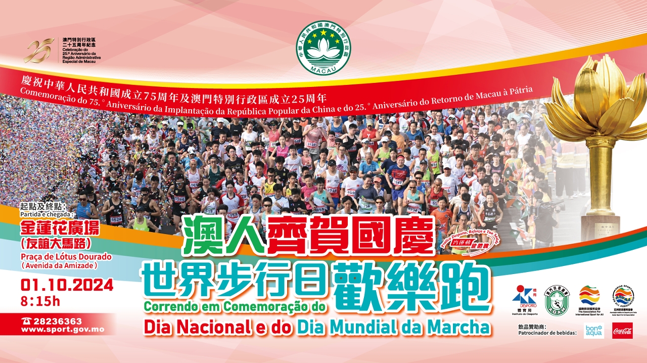 为热烈庆祝中华人民共和国成立75周年及澳门特别行政区成立25周年,并响应国际群众体育协会提倡的“世界步行日”,体育局将于10月1日早上8时15分在金莲花广场举行 “2024澳人齐贺国庆世界步行日欢乐跑”。活动当日将举行国庆升旗礼、欢乐跑及步行庆祝活动,让澳门市民透过齐参与有益身心的体育项目,一同感受双庆的喜悦。