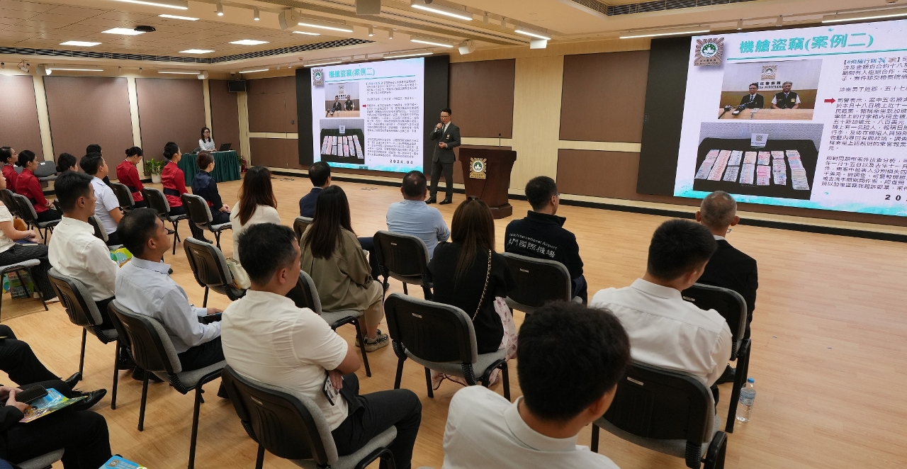 启动仪式上,司警局向两间公司代表致送纪念品,感谢他们对局方警务工作的鼎力支持。同时,司警局举办“预防机舱盗窃”培训讲座,讲解本澳机舱盗窃案发情况、常见的盗窃手法及预防策略,澳门国际机场专营股份有限公司、澳门航空股份公司组织相关工作人员参加。