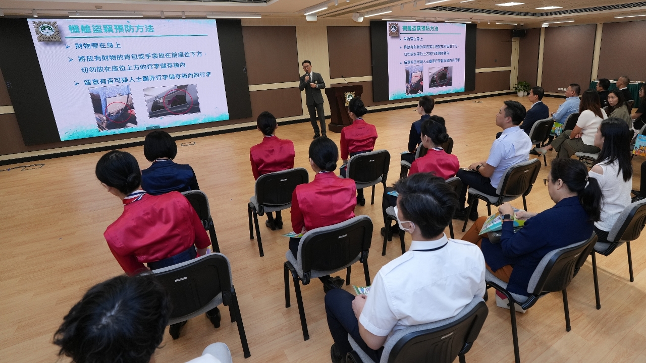 讲座结束后,“时刻做好防盗,旅途安心之道”防罪影片首映仪式随即举行。该影片由司警局及澳门航空股份公司合作摄制,片中展示窃贼的作案手法和预防方法,并由司警局刑事侦查员和澳航空服员作出提防机舱盗窃的呼吁,提醒乘客加强警惕并妥善保管个人财物。仪式结束后,司警局社区警务及公共关系处及侵犯财物罪案调查科人员随即前往澳门国际机场,开展相关防罪宣传,呼吁市民和旅客在乘搭飞机时须提高警觉,减低财物被盗的风险。