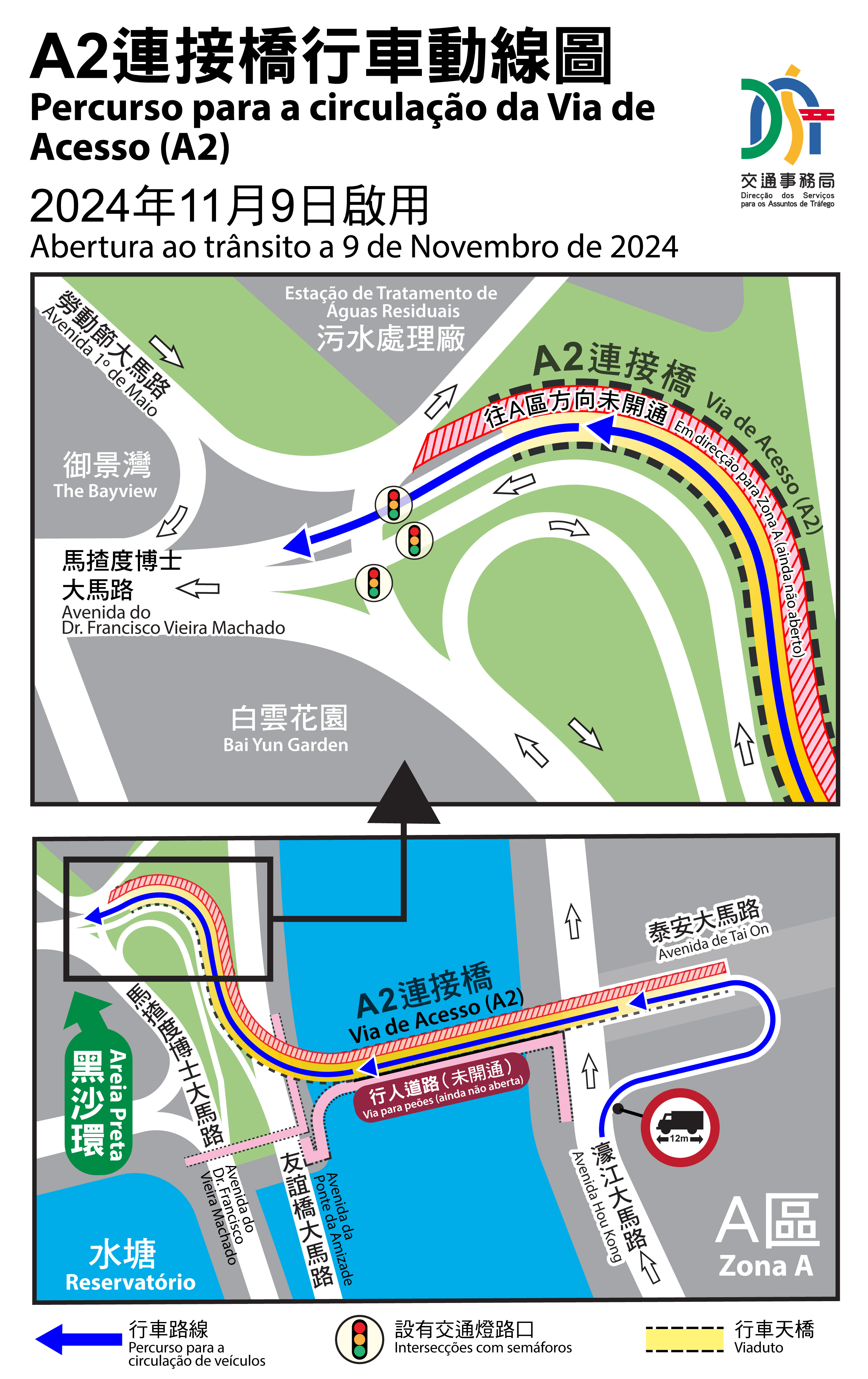 为提升跨区通行能力及提前让驾驶者在大赛车举行前熟习相关交通安排,A2连接桥(下简称“A2桥”)将于11月9日(周六)开通由A区往澳门半岛方向的车行道,届时,车辆(仅限车长不超过12米车辆)可由濠江大马路近泰安大马路的入口进入A2桥,经设于马揸度博士大马路(介乎污水处理厂和白云花园)的出口往澳门其他区域,具体请参阅行车安排示意图。目前,由于泰安大马路部份路段仍在进行共同管道及道路施工,故短期内车辆未能由澳门半岛通往A区。A2桥由黑沙环往A区方向的车行道将配合A区工程的施工进度适时开放。
