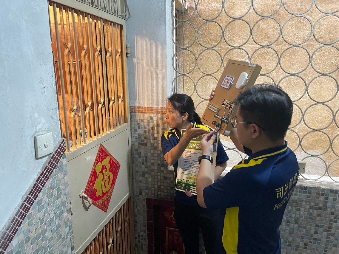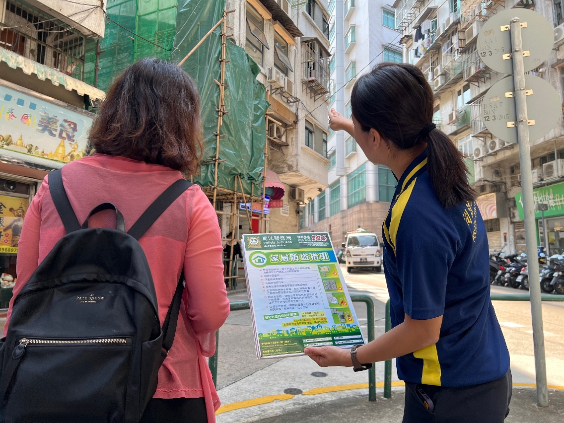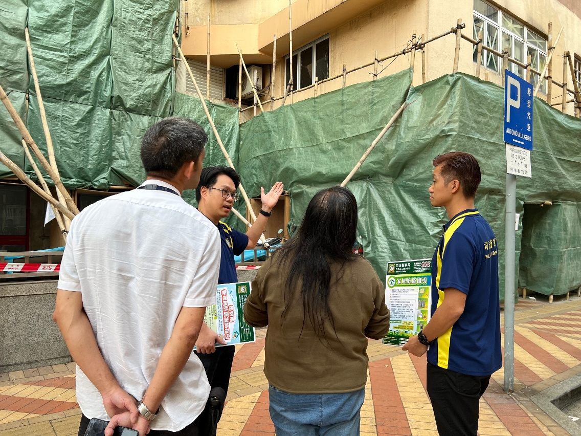 为推动大厦住户主动参与大厦防罪,司警局人员于进行棚架工程的大厦及邻近楼宇展开家居防盗宣教工作,向居民教授简单实用的家居防盗办法和要点,并呼吁他们经常做好家居防盗措施,时刻保持警惕并与邻里守望相助;如发现可疑情况或遇到犯罪,应在确保自身安全的情况下尽快报警求助。