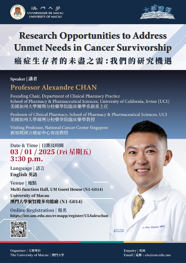 澳门大学将于1月3日(星期五)举办大学讲坛之“癌症生存者的未尽之需:我们的研究机遇”讲座,邀请美国加州大学尔湾分校药学院临床药学系创系主任及教授Alexandre Chan主讲,分享其实验室对癌症生存者未满足需求的研究,探讨缓解不同需求及改善其身心健康和福祉的研究。欢迎有兴趣人士参加。