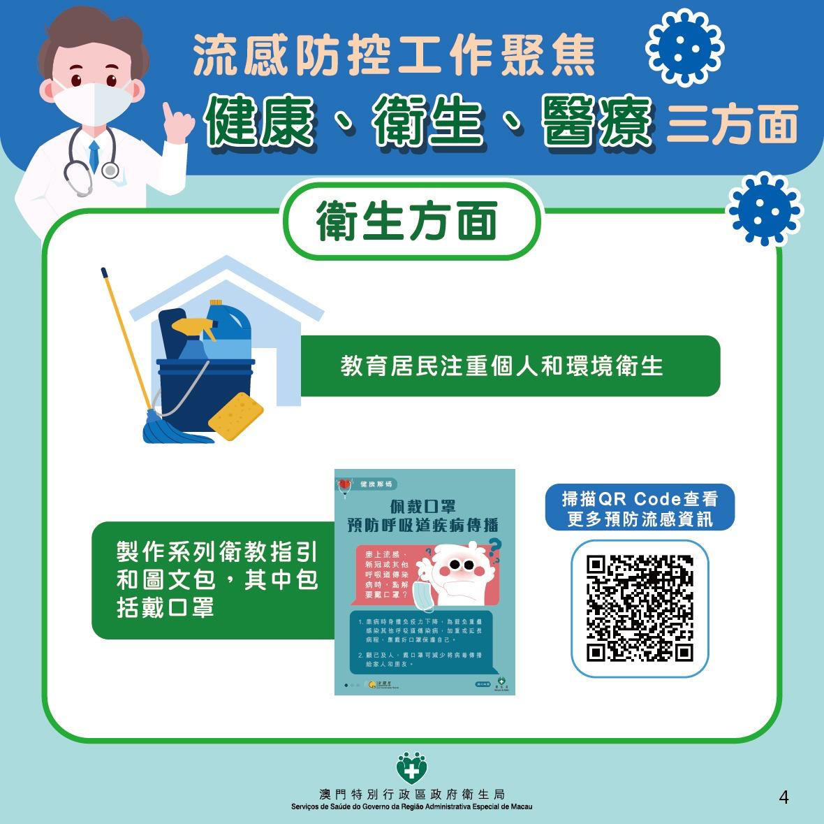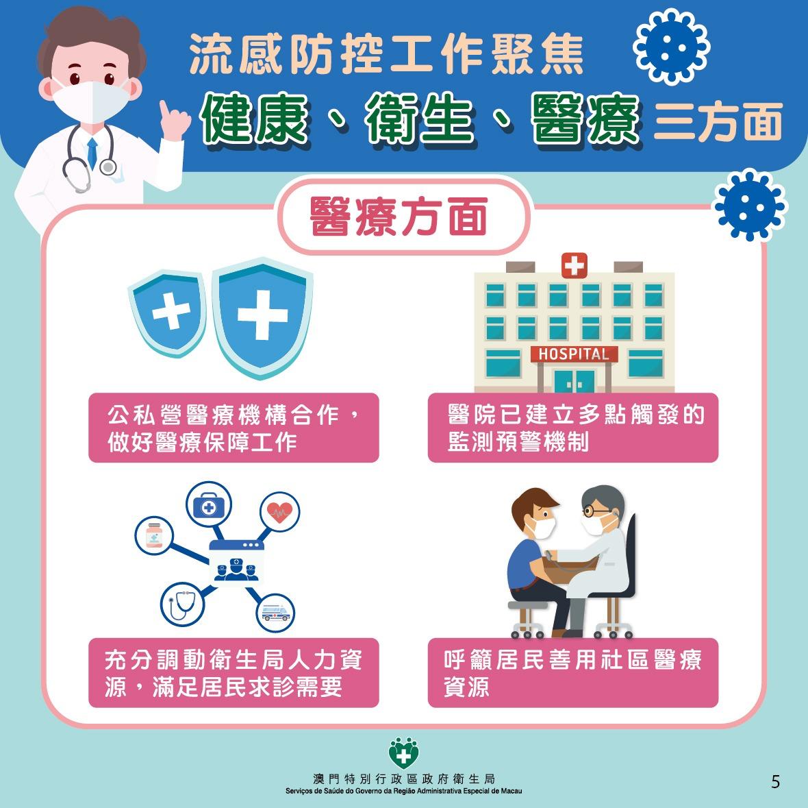 卫生局、教育及青年发展局、社会工作局将展开一系列跨部门防控工作,将从健康、卫生和医疗三个方面着手。在健康方面,卫生局将于本周末(1月18及19日)与社会团体和医疗机构合作,在全澳各区设置15个社区预防流感咨询站,加强健康教育及推动疫苗接种的工作;在卫生方面,已制作了一系列教材、图文包 ,并通过网络(传染病资讯网页https://www.ssm.gov.mo/portal/csr/ch/main.aspx)展开宣传教育工作,宣传维持个人与环境卫生的重要性;在医疗方面,仁伯爵综合医院已建立多点触发的监测预警机制,并充分调配人力资源。目前急诊部门维持成人平均等候时间约1小时,高峰期约2小时,呼吁居民善用社区医疗资源,包括卫生中心、社区门诊及私营诊所等。此外,近期亦会与全澳医疗机构及医疗业界召开座谈会,共同商讨如何应对因流感导致的呼吸道传染病医疗需求上升的情况。