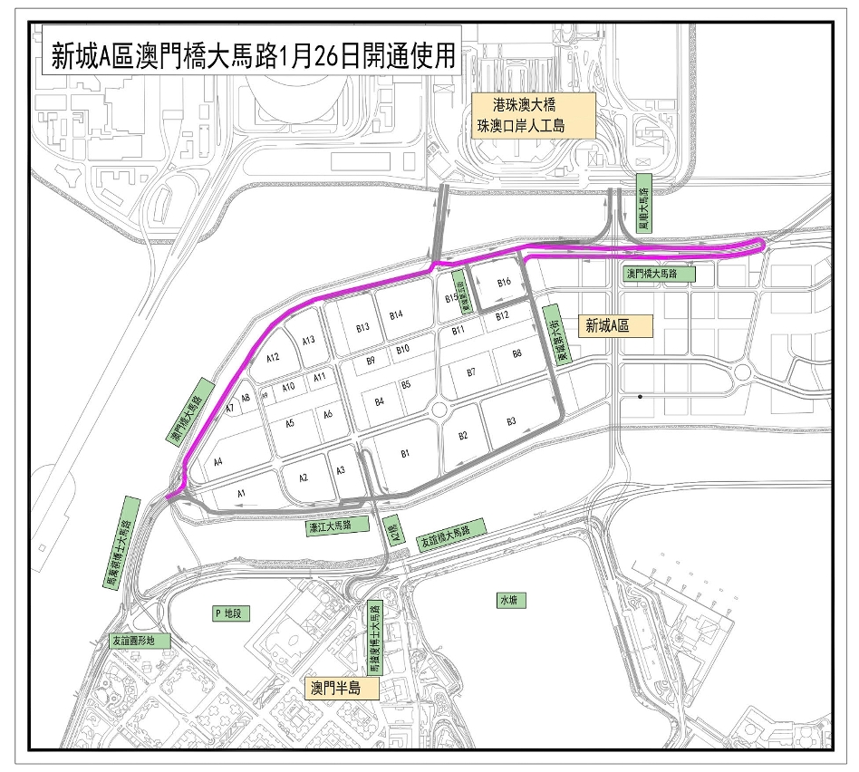 新城A区东侧的澳门桥大马路部分行车线将于2025年1月26日开通,届时由澳门半岛进入港珠澳大桥口岸及澳门大桥的车辆需使用新建的澳门桥大马路,行车动线会比现时更加便捷,而镜海大马路将于同日起临时封闭只予进入地盘及特许车辆行驶(详见附图),请驾驶者留意现场交通指示及改道后的行车路线。