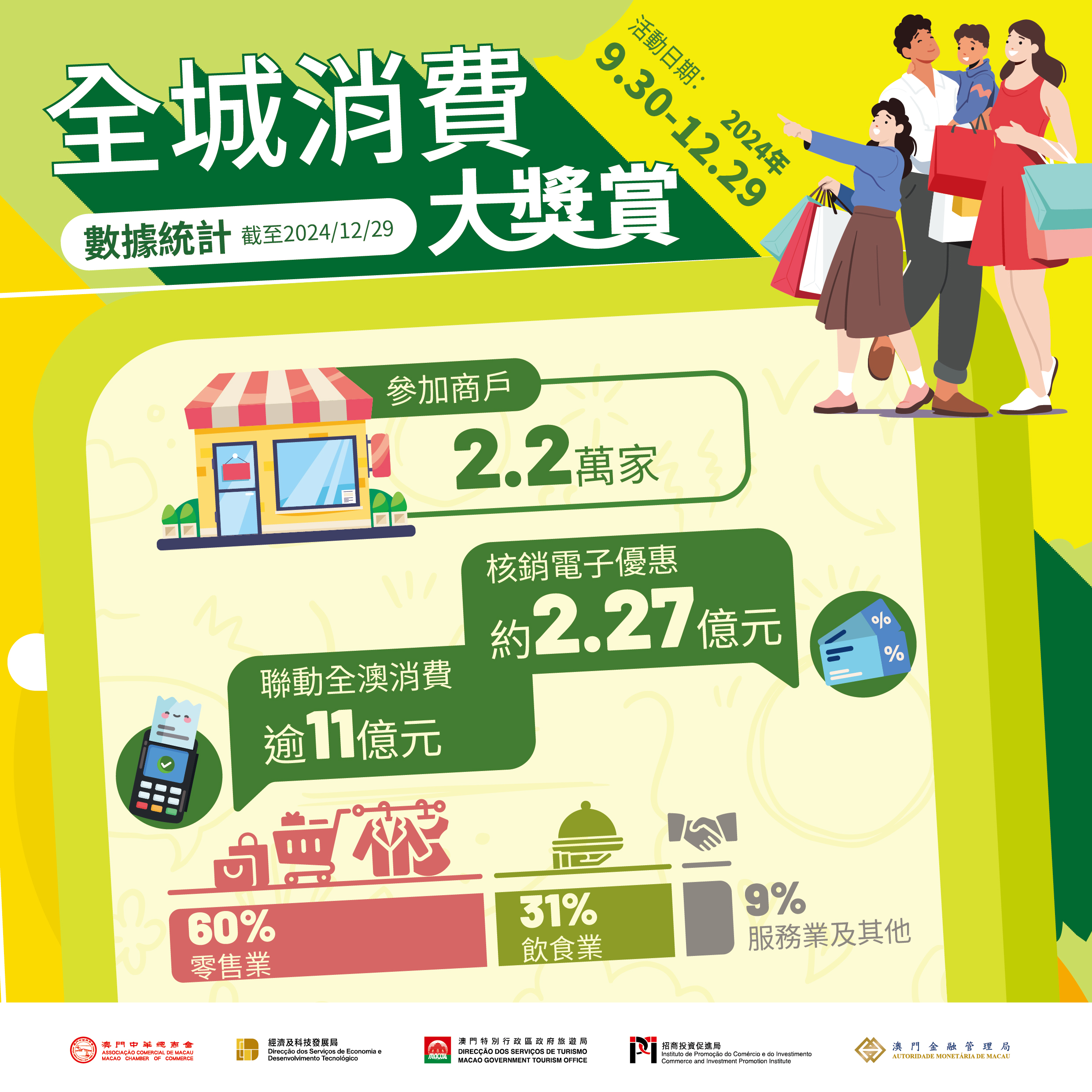 活动参与商户约2.2万间,电子优惠总核销金额约2.27亿元,联动全澳消费逾11亿元。受惠商户遍布全澳不同行业,零售业约占60%、餐饮业约31%,服务业及其他行业约9%。活动期间,获559间商户响应同步迭加提供额外消费优惠,齐心合力带动社区消费。