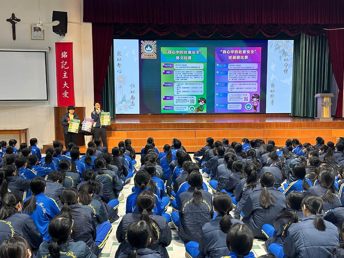 由澳门特别行政区政府及中央人民政府驻澳门特别行政区联络办公室联合举办的“我心中的社会安全”征文及短视频比赛现正接受报名,司法警察局由2024年12月上旬开始持续派员走进校园开展相关宣传推广工作,鼓励学生积极参加。