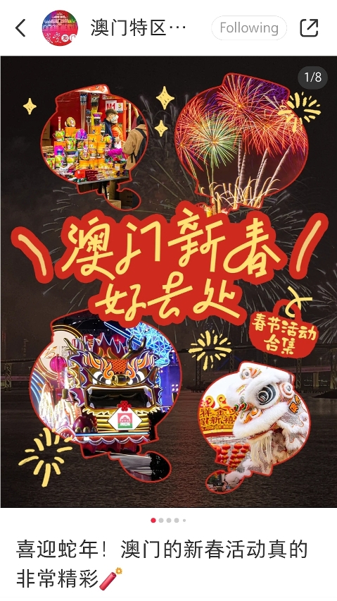 有关“欢乐春节 - 2025年龙腾舞跃贺新春”社区巡演及旅游局农历新年期间之活动详情,请浏览澳门旅游推广网站 https://www.macaotourism.gov.mo 或关注“澳门特区旅游局”微信瞭解更多内容。