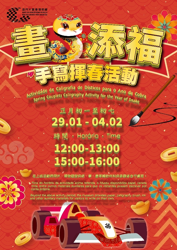 旅游局辖下的澳门大赛车博物馆在新春期间包括2月4日星期二(大年初七)定休日照常开馆,又于1月29日至2月4日举办 “画蛇添福”手写挥春活动。