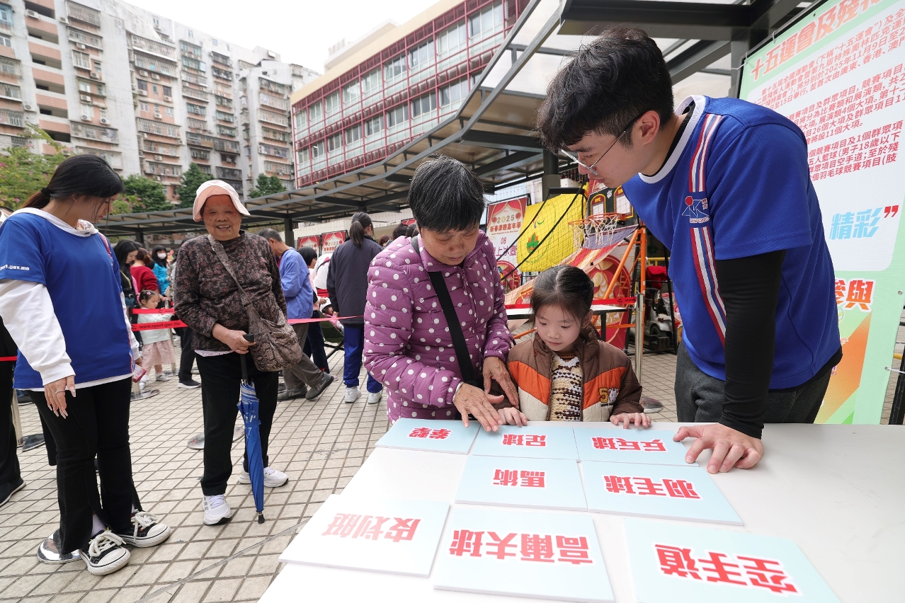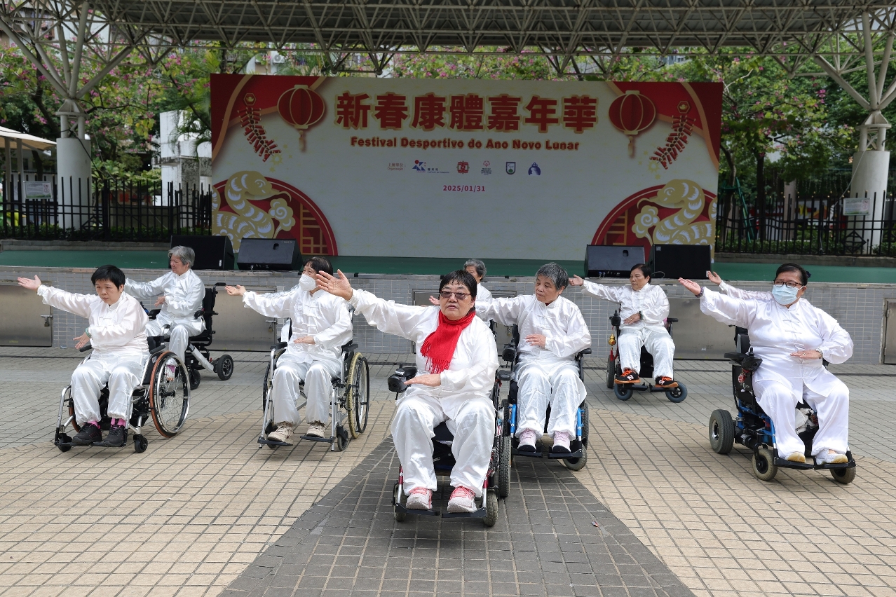 由体育局与澳门工会联合总会体育委员会、澳门特殊奥运会、中国澳门残疾人奥委会暨伤残人士文娱暨体育总会及澳门聋人体育会共同举办的“新春康体嘉年华”于下午2时至5时在佑汉街市公园广场举行。现场除了贺年特色摊位游戏,更有龙狮源流文化介绍、龙狮献瑞表演、舞醉龙表演,及残疾人士体育表演。此外,为迎接将于本年11月9至21日举办的第十五届全国运动会(全运会),现场特别增设了与全运会相关之有奬问答游戏、认识澳门全运会参加项目的摊位游戏,藉着全运会的契机推动大众体育,让更多公众在大众体育活动中了解全运会的资讯。新春康体嘉年华为市民送上新春祝福及增添喜庆节日气氛,场面热闹。
