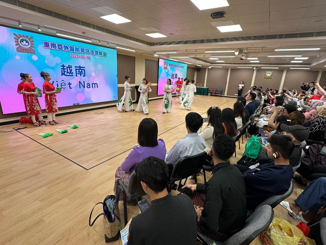 讲解会由司警局多个刑侦部门的资深刑事侦查人员主讲,内容涵盖禁毒、预防人口贩卖及清洗黑钱、录制或散播未成年人色情物品的法律责任,以及司警局的报案程序等防罪资讯。主讲人员即时解答外雇对警务工作的疑问,并鼓励他们如遇到或怀疑发生犯罪,应勇于向警方举报。此外,司警局人员还派发多语种防罪宣传单张,并呼吁他们将相关防罪资讯分享给同乡和朋友,共同提升防罪能力,警民携手共建安全、和谐的社区环境。活动现场气氛热烈,出席者还带来精彩的民族歌舞表演,为讲解会增添欢乐氛围。
